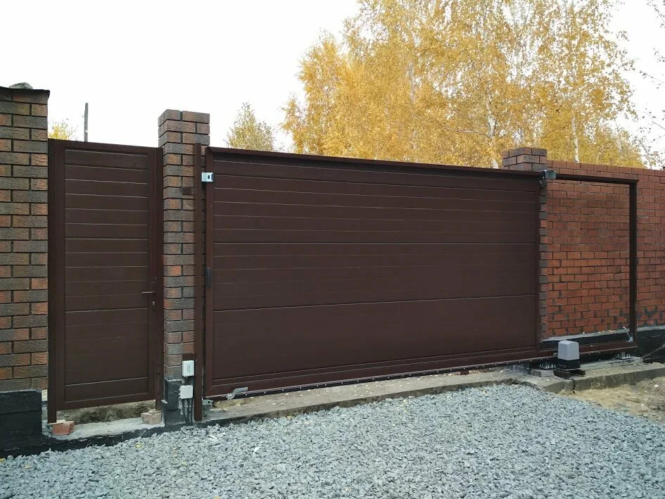 Откатные ворота из профнастила с встроенной калиткой и автоматикой